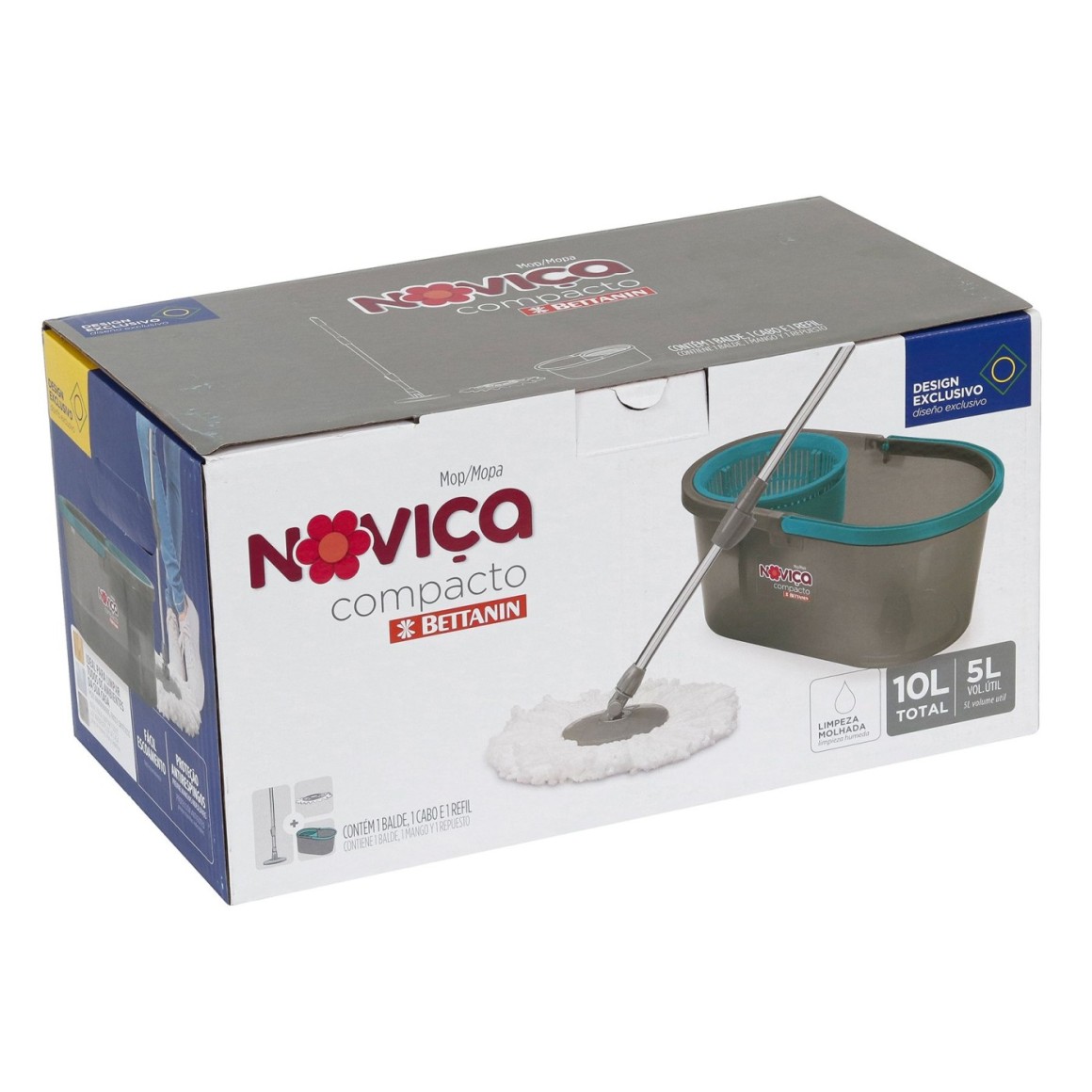 O Mop Compacto da Noviça possui design exclusivo com sistema de trava na alça, o que garante estabilidade e facilita o manuseio do balde. Ele conta com sistema de torção no cabo e na centrífuga do balde, para um melhor aproveitamento da água e uma limpeza mais eficiente. Esse mop é ideal para ambientes pequenos. O refil compatível com esse produto é o Refil Mop Fit de Microfibra Noviça.