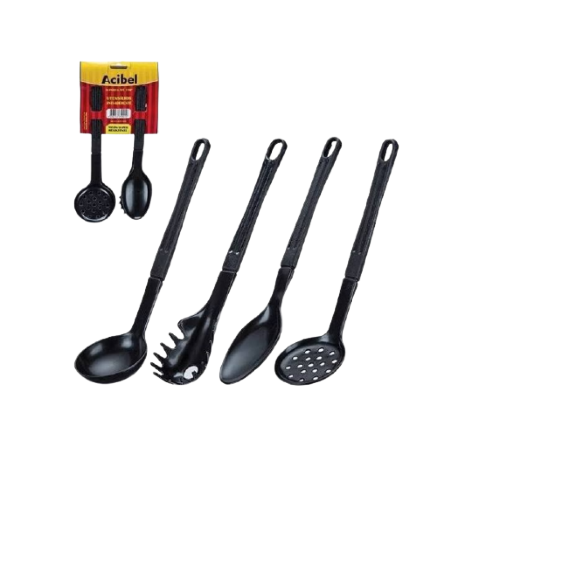 Jogo de talheres 4 peças concha, escumadeira, colher e pegador de massa.