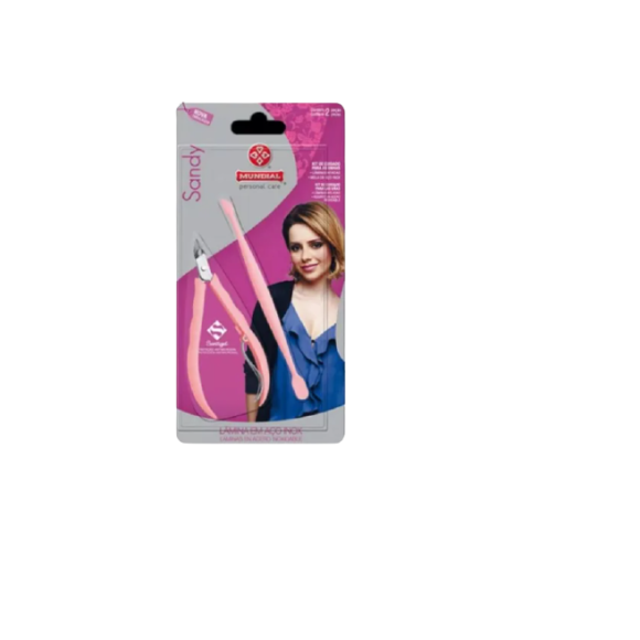 AÇÃO/Ativos: Alicate com mola resistente em aço inox; Cabos coloridos em nylon com reforço de fibra de vidro, tornando-os mais resistentes; Cabo ondulado para melhor ajuste aos dedos; Espátula dupla para empurrar e raspar a cutícula; Embalagem: Blister.