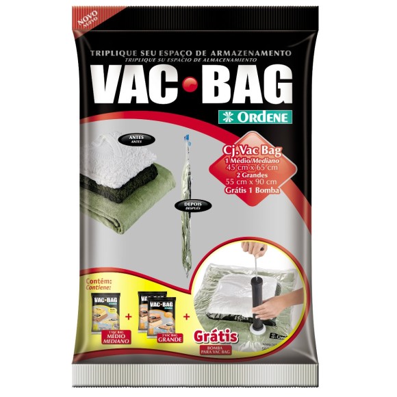 O Vac Bag é ideal para guardar edredons, travesseiros, cobertores, casacos e etc, possui sistema a vácuo que permite triplicar o espaço de armazenamento. É reutilizável, impermeável e prático, protege suas peças da umidade, poeira, mofo, sujeita e insetos.