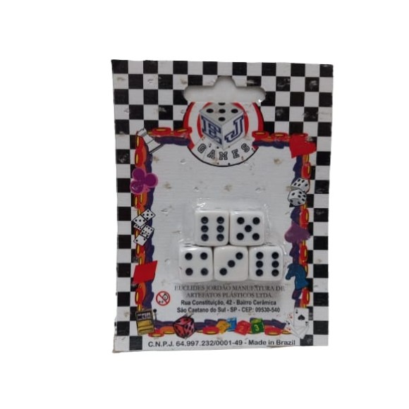 Cartela com 5 dados de seis lados (d6). Perfeito para suas partidas de RPG, jogos de tabuleiro, e outros tipos de jogatinas com fatores de sorte.