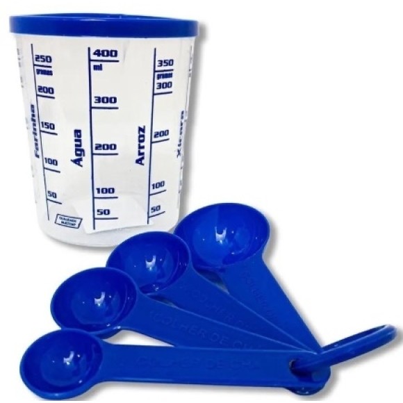 Contém: 1 copo medidor, 1 tampa e 4 colheres medidoras.