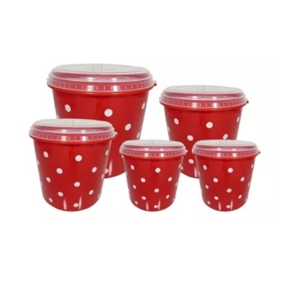 Este conjunto inclui cinco potes de plástico redondos de diferentes tamanhos para atender às suas necessidades de armazenamento na cozinha.